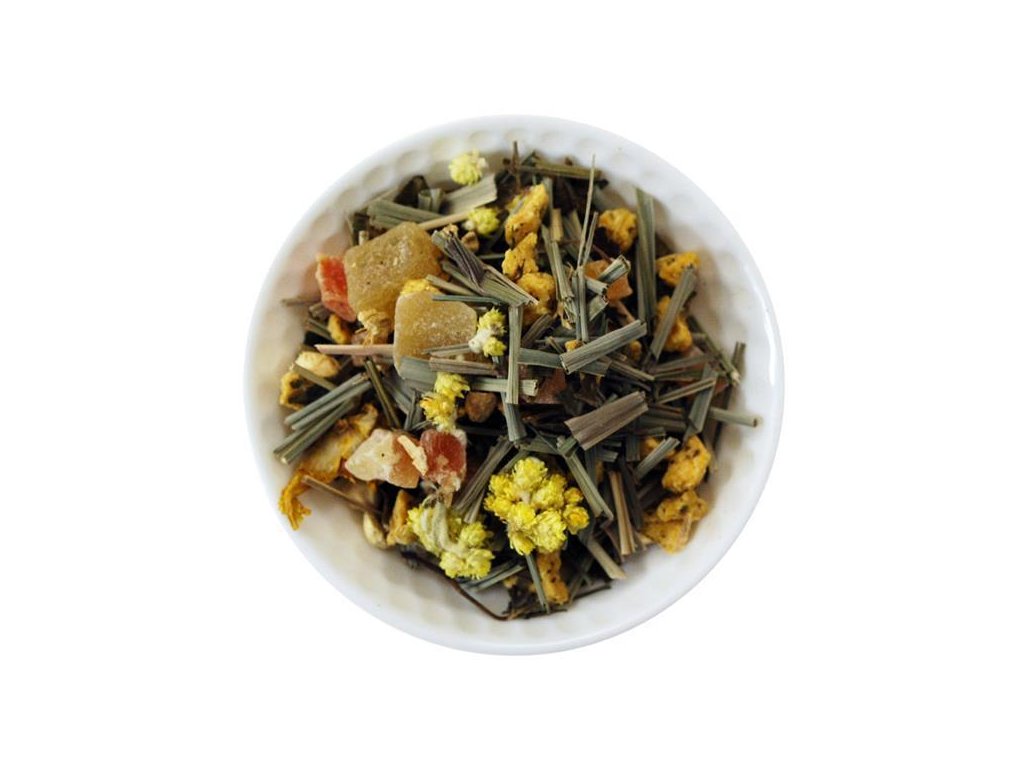 Energetická zmes bylín a korenín s citrónovou trávou, korenistým zázvorom a šťavnatými kúskami ovocia, ochutená pomarančovým džúsom.