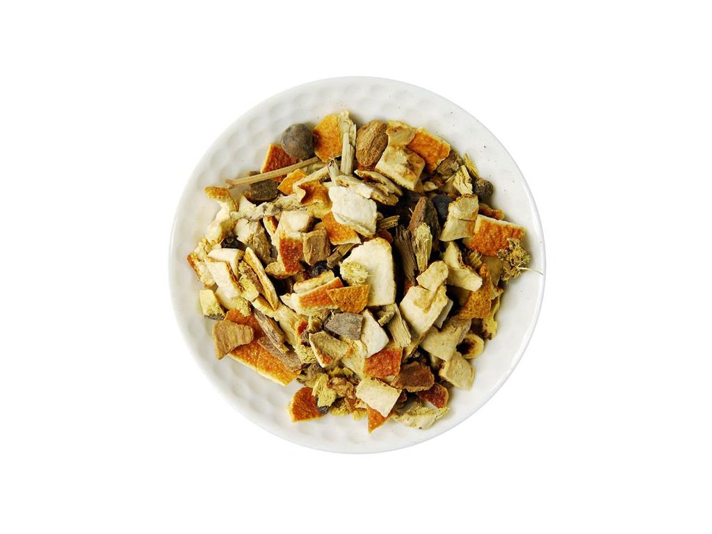 Zloženie: pomarančová kôra, sladké drievko, zázvor, škorica, čierne korenie, citrónová kôra, fenikel, klinčeky, kardamon, nové korenie, borievka
