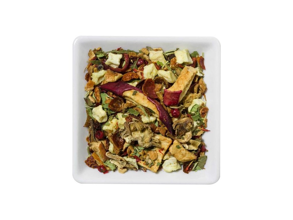 Zloženie: jablká kúsky, šípky, biely ibištek, rozmarín, jablko plátky, jablkové hranolky, slnečnica, ružové korenie, zázvor, list černice, prírodná aróma