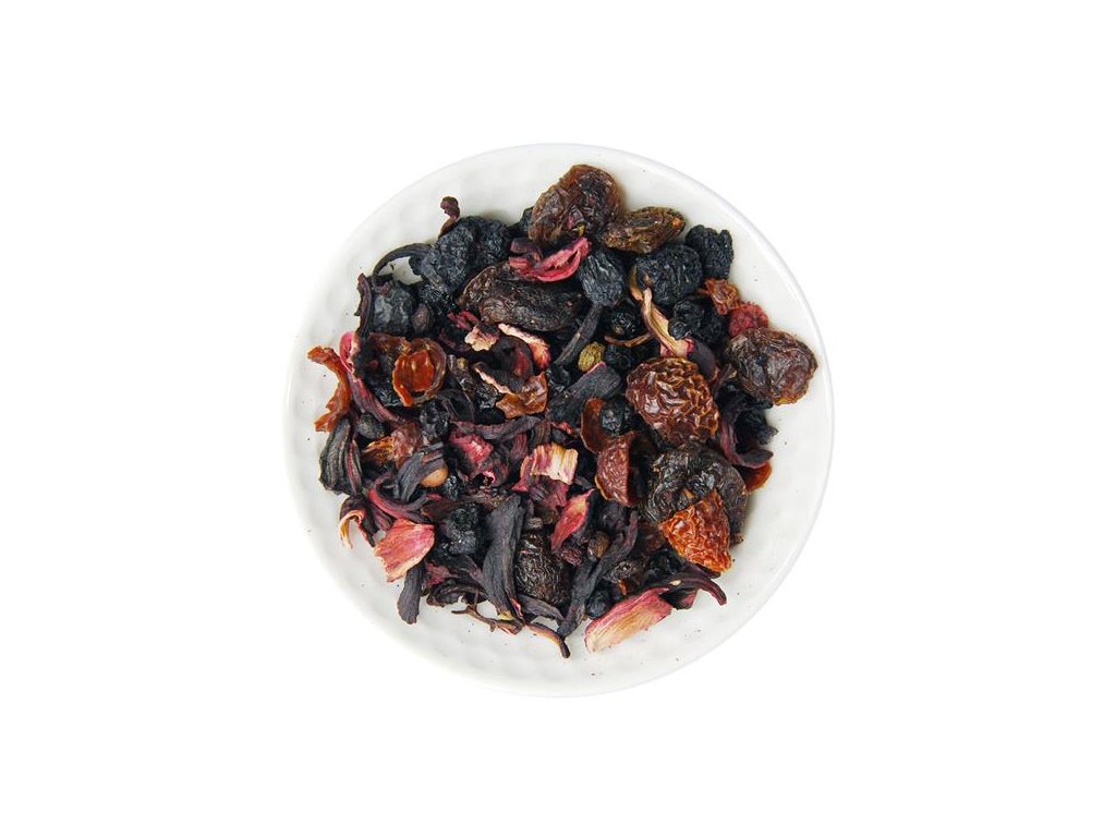 Zloženie: ibištek, hrozienka, plod bazy čiernej, čierna jarabina, malina, jahoda, šípky, aróma