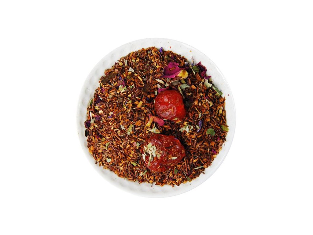 Zloženie: Rooibos Massai 84%, kúsky čerešní* (čerešňa, cukor, oxid siričitý, kyselina citrónová, allura červená), listy ostružiny, kvety slezu a ruže, aróma