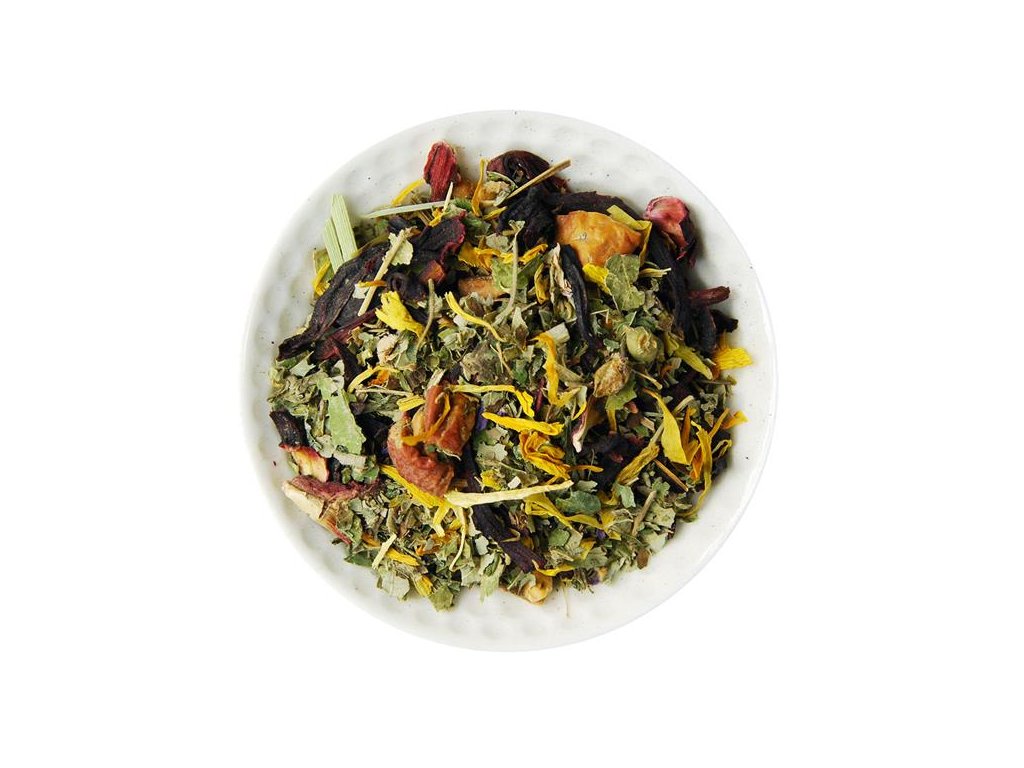 Zloženie: ibištek kvet, jablko, ostružina list, marocká mäta, medovka vňať, slez kvet, nechtík kvet, slnečnica kvet, túžobník vňať