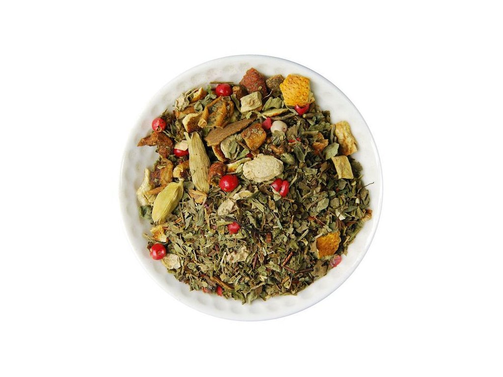 Zloženie: Tulsi (min. 32%), jablko, Rooibos zelený, kúsky zázvoru (8%), červené korenie, kardamón, škorica, pomarančová kôra, prírodná aróma