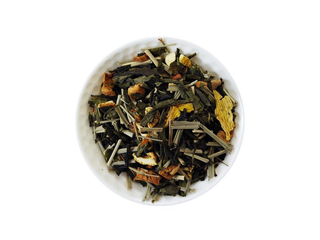 Zloženie: zelený čaj, jablko, citrónová tráva, citrónová kôra, citrónové plátky, žihľava, listy konope, guarana semeno, sušená dužina pomarančovej šťavy, slnečnica listy, prírodná aróma